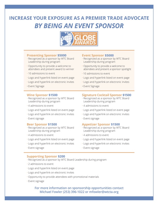 At the World Trade Center Tacoma, our mission is to connect local businesses with the world and the world with our community. When you sponsor WTC Tacoma, you’re investing in economic growth, global partnerships, and the success of small- and medium-sized enterprises in the Pacific Northwest.