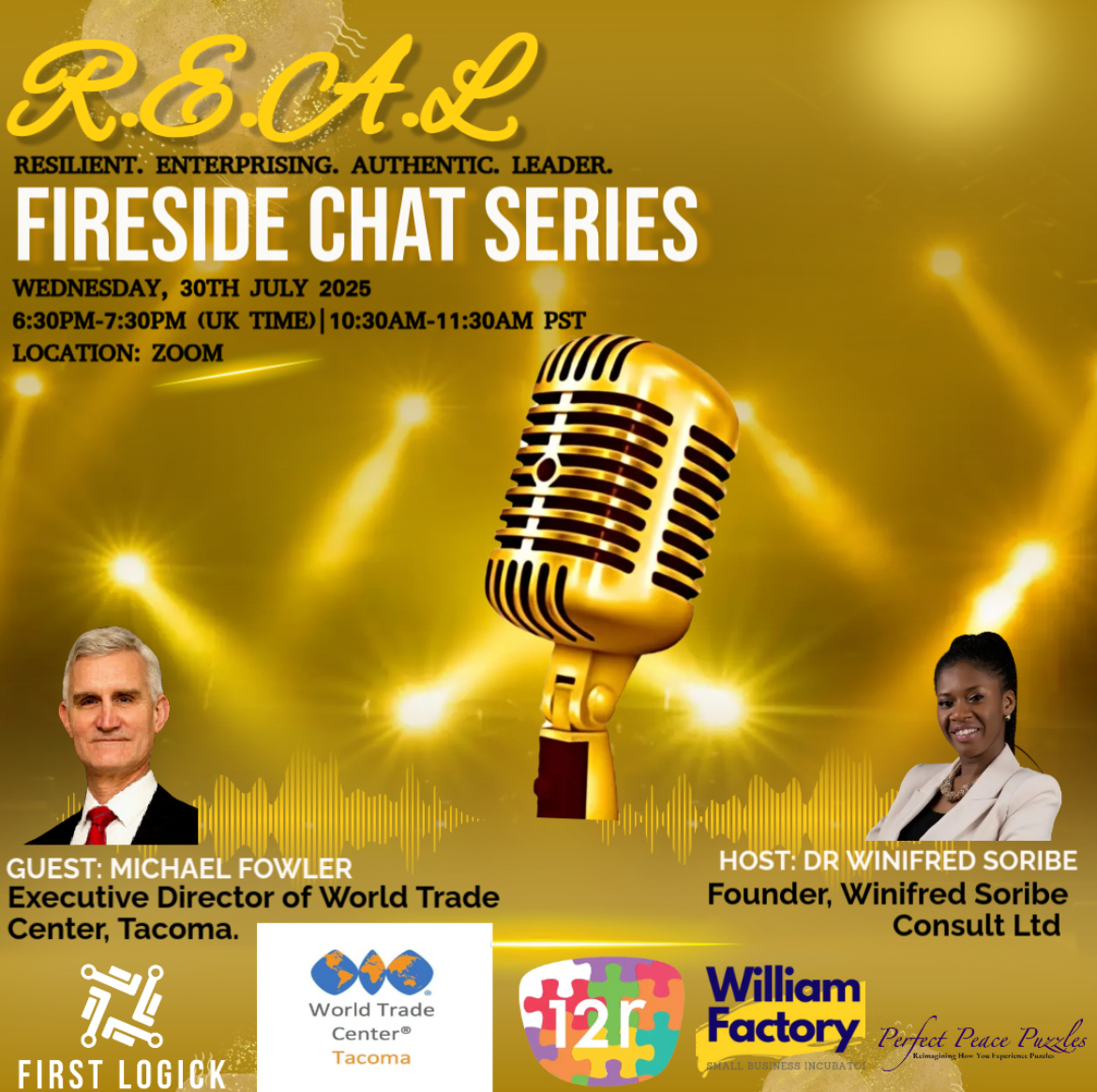 Don’t miss this exciting R.E.A.L. Entrepreneurs Fireside Chat, hosted by Dr. Winifred Soribe of Founders and Mentors by 12 Ronnies and co-sponsored by Tacoma’s William Factory.